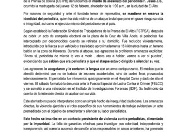 Asociación Nacional de Periodistas de Bolivia y la Confederación Sindical de Trabajadores de la Prensa de Bolivia denuncian el intento de asesinato a periodista, en El Alto