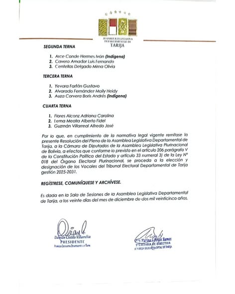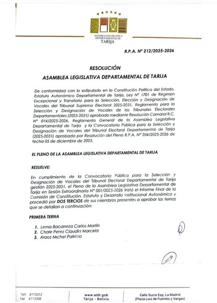 En cumplimiento de la **Convocatoria Pública para la Selección y Conformación de Vocales del Tribunal Electoral Departamental (TED) de Tarija**, gestión **2025–2031**, la **Asamblea Legislativa Departamental de Tarija (ALDT)** aprobó la conformación de las **ternas correspondientes**, durante la **Sesión Extraordinaria N.° 001/2025–2026**, mediante Resolución del Pleno.