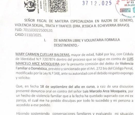 La vicepresidenta de la Asamblea Permanente de Derechos Humanos de Bolivia (APDHB), Yolanda Herrera, afirmó que el proceso judicial en contra de Marcelo Arce Mosqueira, hijo del presidente del Estado, debe continuar de oficio, pese al desistimiento presentado por la presunta víctima.
