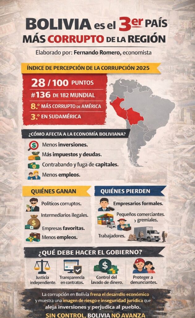 Bolivia registra 28/100 en el Índice de Percepción de la Corrupción 2025, ubicándose como el 3er país más corrupto de Sudamérica. Este nivel refleja un problema estructural, no episódico: impunidad en casos de alto nivel, debilidad institucional y captura de espacios públicos sensibles como hidrocarburos, aduanas y empresas estatales. La corrupción actúa como un impuesto oculto que encarece obras, distorsiona contratos y desalienta la inversión privada. Además, incrementa el riesgo país, fomenta el contrabando y reduce la recaudación tributaria. El resultado es menor crecimiento, menos empleo formal y mayor desconfianza económica. En términos simples: la corrupción frena el desarrollo y deteriora la seguridad jurídica.