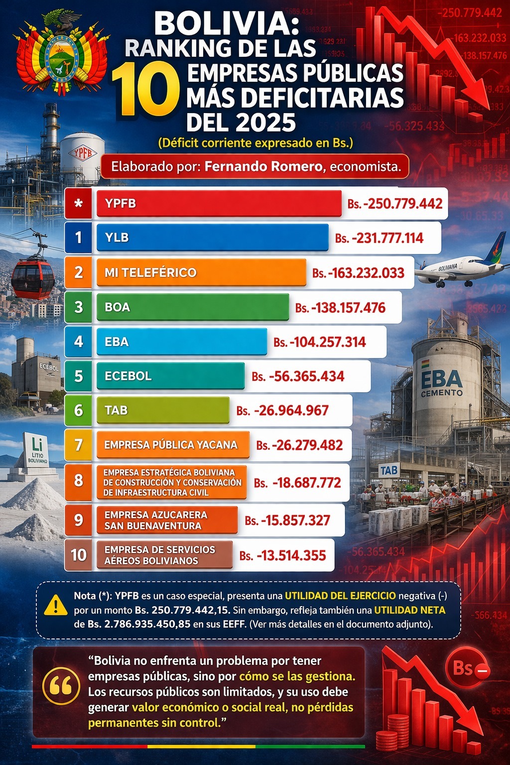 Las empresas públicas en Bolivia cumplen funciones sociales y estratégicas, pero su creciente déficit financiero refleja problemas estructurales de gestión, eficiencia y diseño. El análisis de las gestiones 2024 y 2025 muestra un deterioro significativo, con empresas como YPFB (Bs. -250,7 millones), YLB (Bs. -231,7 millones), Mi Teleférico (Bs. -163,2 millones) y BOA (Bs. -138,1 millones) concentrando las mayores pérdidas. Esta situación evidencia que el problema no es coyuntural, sino persistente y cada vez más relevante para la estabilidad fiscal del país.