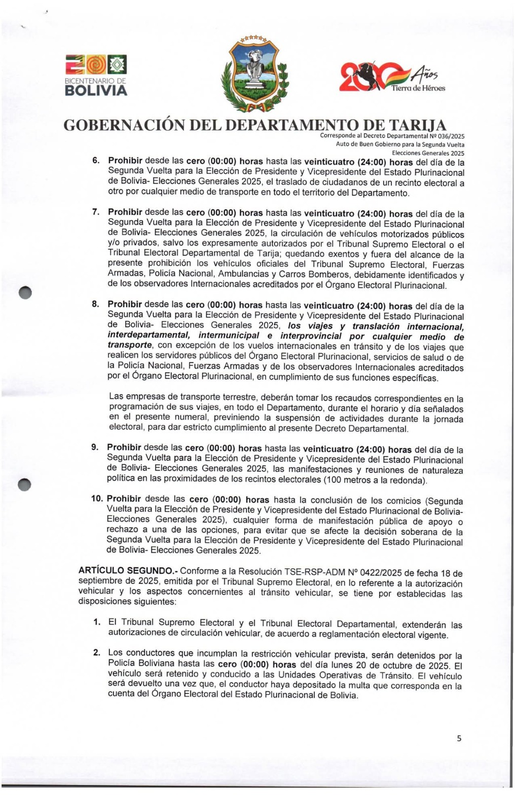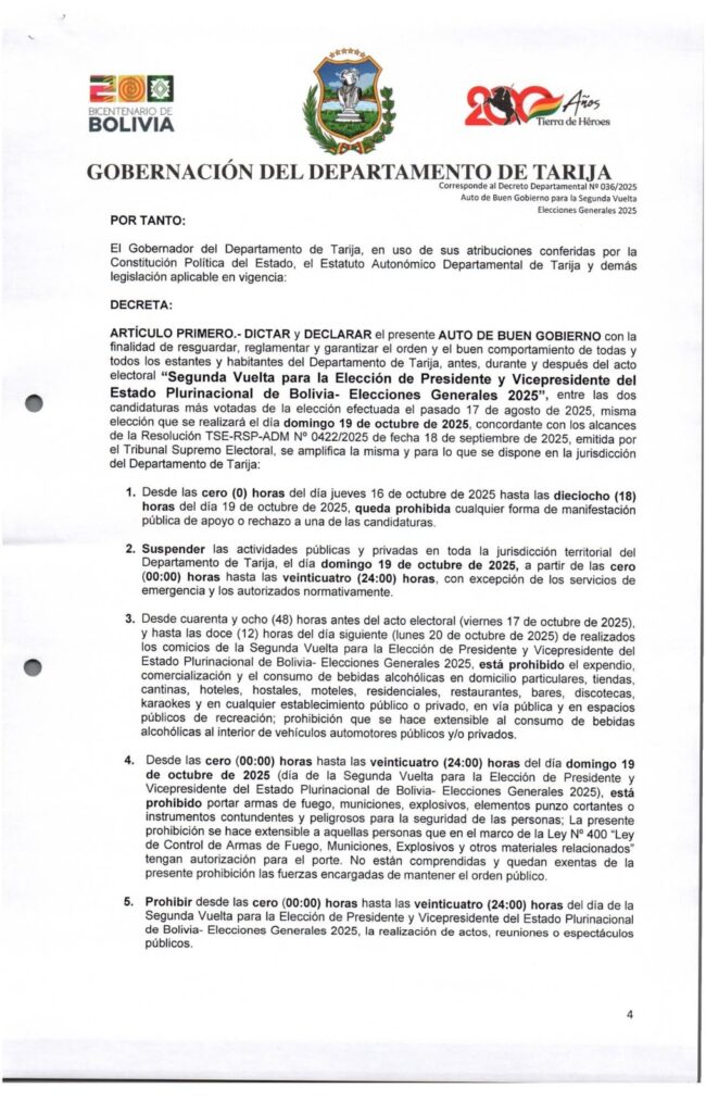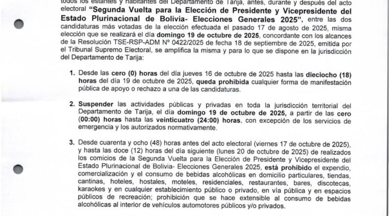 El presidente del Tribunal Electoral Departamental (TED) de Tarija, Óscar Gutiérrez, informó que a partir de las cero horas del jueves 16 de octubre entra en vigencia el periodo de silencio electoral y el Auto de Buen Gobierno, medidas que regirán a nivel nacional y departamental hasta la jornada electoral.