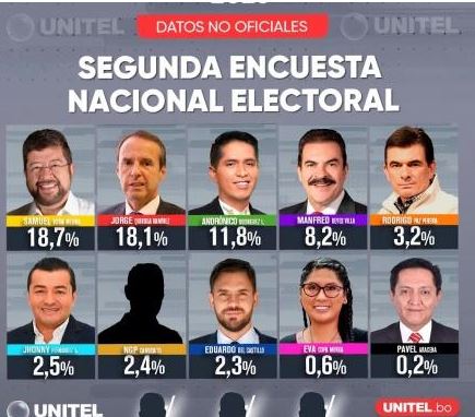 Samuel Doria Medina y Jorge Tuto Quiroga, ambos representantes de fuerzas opositoras, lideran la segunda encuesta nacional de intención de voto entre los candidatos inscritos ante el Tribunal Supremo Electoral (TSE) para los comicios del próximo 17 de agosto. El estudio fue elaborado por Ipsos-CIESMORI.