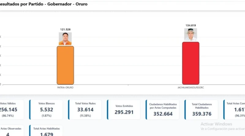 El departamento de Oruro ya tiene a su nuevo gobernador, se trata de Édgar Sánchez, de la alianza Jach’a, que se impuso con 127.543 votos, que representa el 52.52%, frente al candidato Óscar Chambi de la Alianza Patria Oruro que obtuvo 115.240 votos que representa el 47.49%.