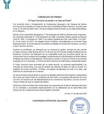 La Conferencia Episcopal de Bolivia se pronunció a través de un comunicado para anunciar el fallecimiento del papa Francisco en el remarca la trayectoria del papa, además que será recordado por su estilo sencillo, su profunda espiritualidad y su mensaje de misericordia que tocó el corazón de millones de fieles de todo el mundo.