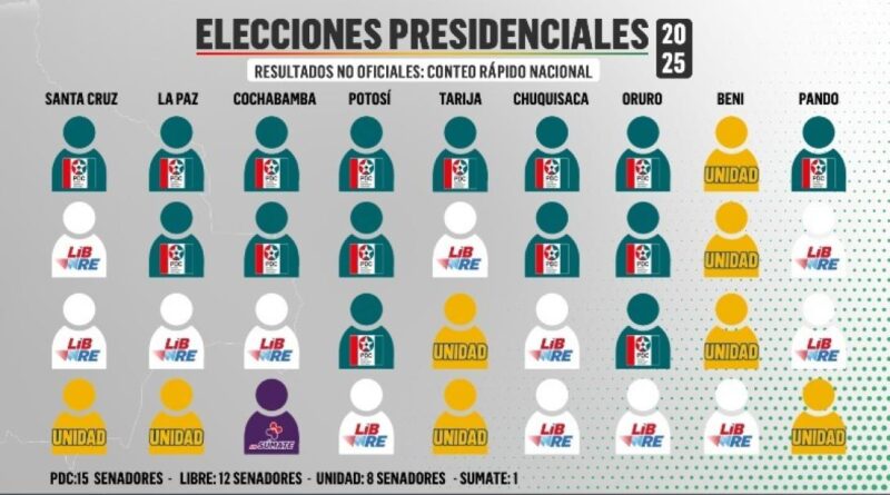 De acuerdo con los datos, el Partido Demócrata Cristiano (PDC) de Rodrigo Paz alcanzó 15 senadores, consolidándose como la primera fuerza parlamentaria. La alianza Libertad y Democracia (Libre) de Jorge Tuto Quiroga se ubicó en segundo lugar con 12 escaños, mientras que la alianza Unidad, liderada por Samuel Doria Medina, logró ocho senadores.