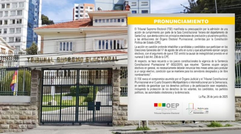 El Tribunal Supremo Electoral (TSE) expresó su preocupación por la reciente admisión de una acción de cumplimiento por parte de la Sala Constitucional Segunda del departamento de Santa Cruz, que según el organismo “atenta contra los principios electorales de preclusión y pluralismo político”, además de afectar las atribuciones que la Constitución Política del Estado (CPE) confiere al Órgano Electoral Plurinacional (OEP).
