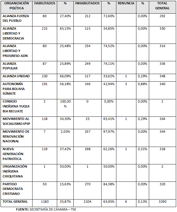 El Presidente a.i. del TSE, Oscar Hassentefuel informó en conferencia de prensa que entre las 10 organizaciones políticas, se registraron en total a 3290 candidatas y candidatos, de los cuales fueron habilitados 2104 y 1.180 inhabilitados: