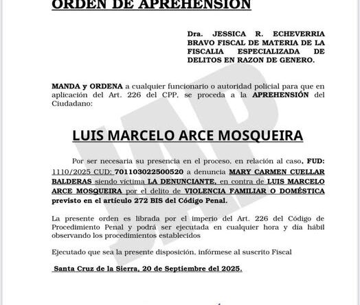 La Fiscalía emitió una orden de aprehensión contra Luis Marcelo Arce Mosqueira, hijo del Presidente del Estado, por presunta violencia familiar o doméstica, tras una denuncia presentada por su pareja, Mary Carmen Cuéllar Balderas. La disposición fue firmada por la fiscal Jessica Echeverría y se formalizó el 20 de septiembre de 2025.