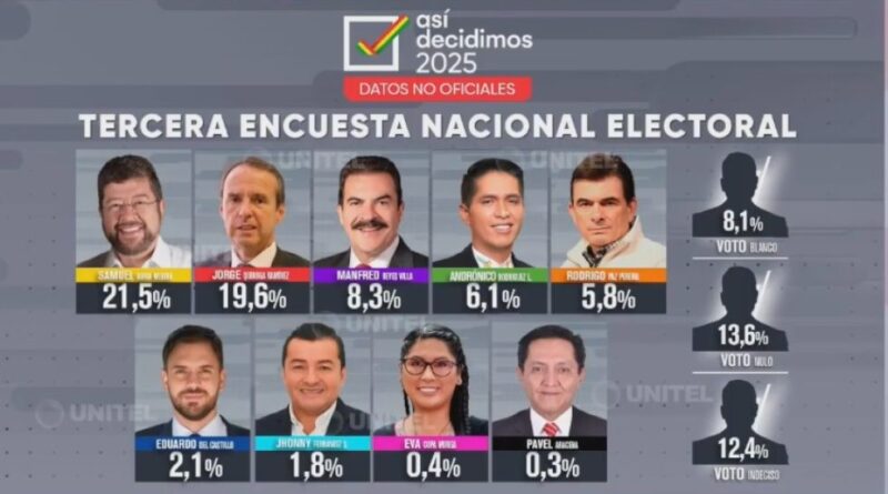 Samuel Doria Medina encabeza la lista con el 21,5% de apoyo ciudadano, seguido de cerca por Jorge “Tuto” Quiroga, que alcanza un 19,6%. En el tercer lugar figura Manfred Reyes Villa con 8,3%, superando a Andrónico Rodríguez, quien cae al cuarto puesto con 6,1%. Rodrigo Paz se posiciona en el quinto lugar con el 5,8%.