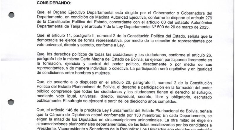 “El Decreto Departamental 036/2025 fue emitido en el marco de las competencias del Gobierno Autónomo Departamental de Tarija, con el propósito de contribuir al éxito del proceso electoral y evitar cualquier hecho que altere la paz social o interfiera en el ejercicio del voto ciudadano”, manifestó Ramos.