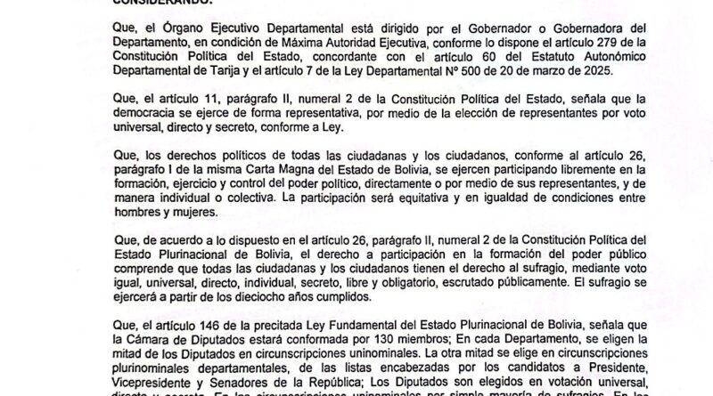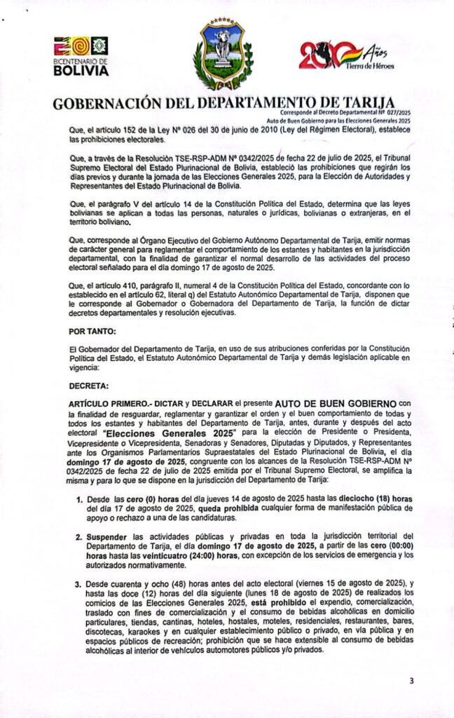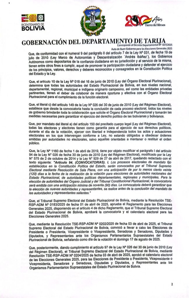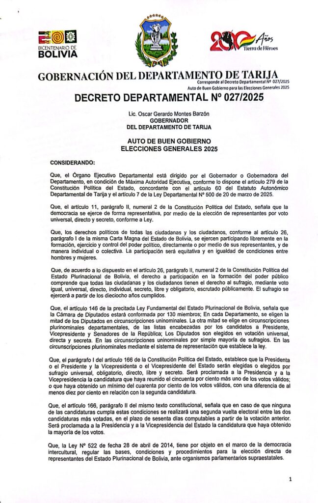 Gobernación de Tarija emite Auto de Buen Gobierno para las elecciones del 17 de agosto