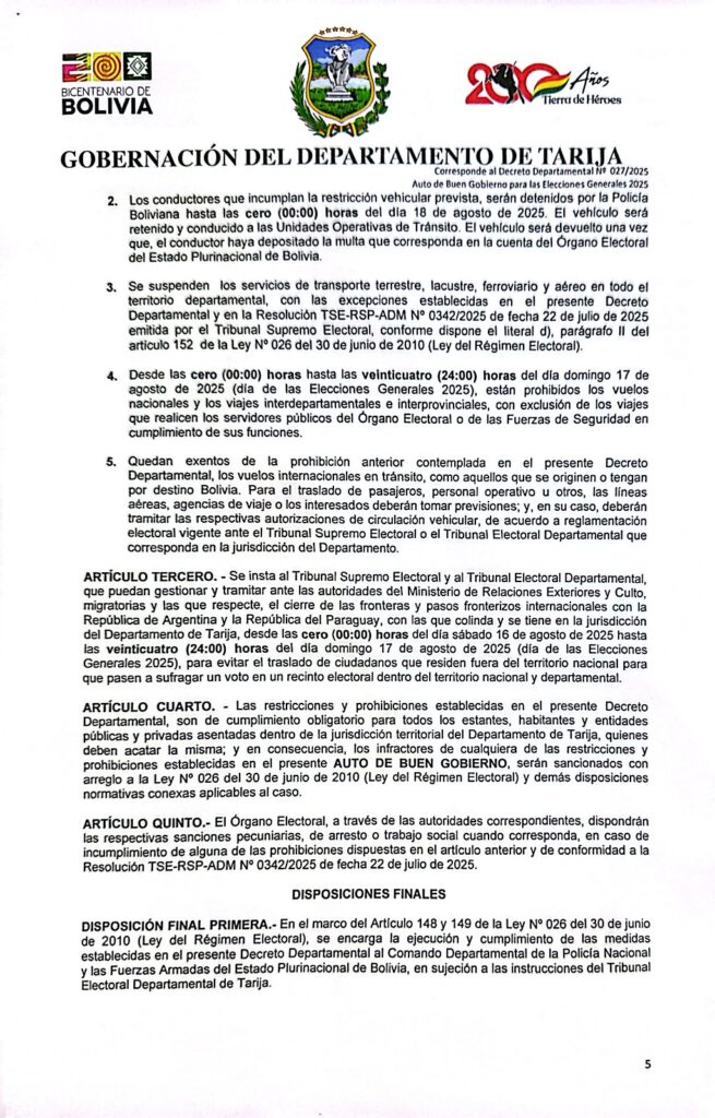 En conferencia de prensa, la autoridad explicó que la norma fue coordinada con el Tribunal Electoral Departamental (TED) de Tarija y se enmarca en las disposiciones del Órgano Electoral Plurinacional (OEP), estableciendo una serie de prohibiciones y medidas para garantizar el orden y la transparencia durante el proceso electoral.
