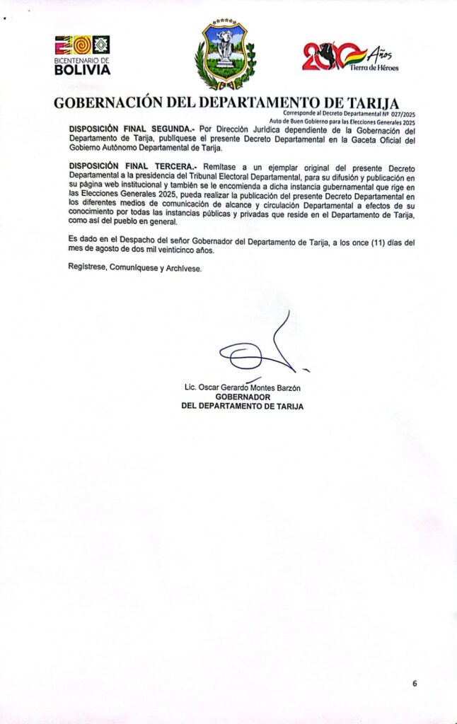 El gobernador del departamento de Tarija, Óscar Montes Barzón, firmó este martes el Decreto Departamental N.º 027/2025 de Auto de Buen Gobierno, en el marco de las elecciones generales que se desarrollarán el domingo 17 de agosto.