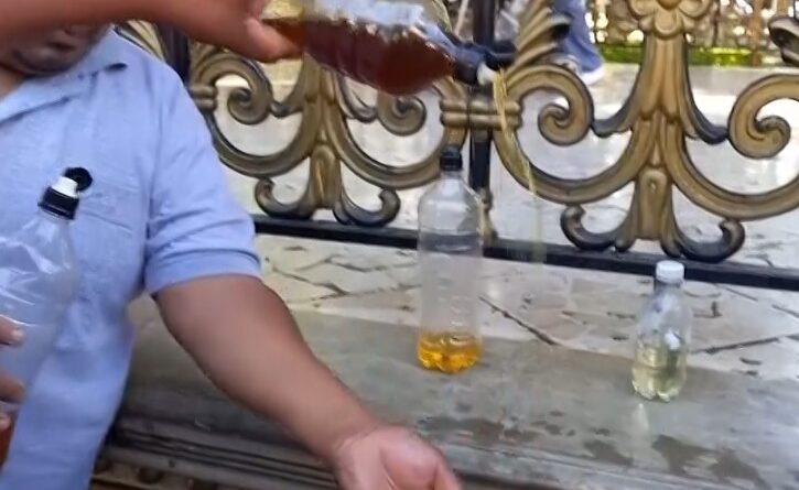 La denuncia fue realizada en la plaza principal Plaza Luis de Fuentes y Vargas, donde el dirigente se presentó con envases que contenían muestras de combustible de diferentes colores, recolectadas en diversos puntos de abastecimiento.