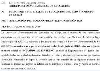 La circular indica que en el marco de sus atribuciones y competencias y en atención al informe emitido por el Servicio Nacional de Meteorología e Hidrología “SENAMHI” , así como las recomendaciones del Servicio Departamental de Salud “SEDES” , comunica que a partir del dia miércoles 04 de junio 2025, entra en vigencia de manera oficial el “horario de invierno” en todo el departamento de Tarija.