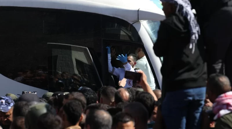 Los palestinos liberados portaban pañuelos palestinos y algunos aparecieron haciendo el signo de la victoria con las manos, antes de abrazar a sus seres queridos. Miembros de la Media Luna Roja les asistieron a su salida de los vehículos.