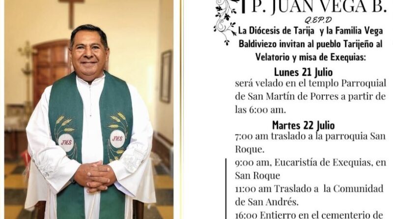 Padre Juan Vega B. será sepultado en su comunidad natal de Pamtipampa según invitación religiosa publicada por la Diócesis de Tarija