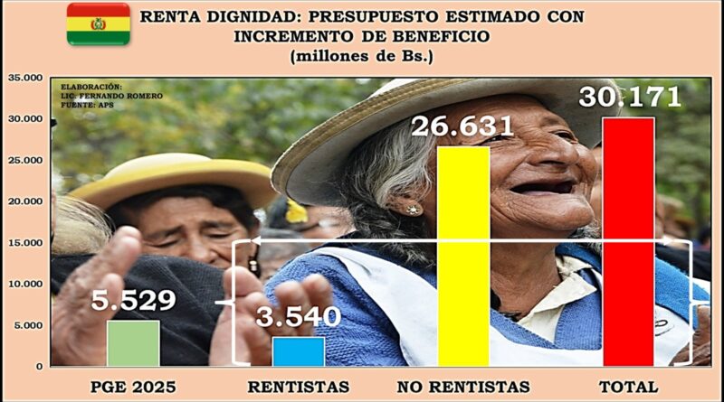 Comencemos indicando que en el año 2024 la Renta Dignidad, según datos oficiales, ha beneficiado a 1.237.380 ancianos, por un monto total de Bs. 4.705 millones. En el Presupuesto General del Estado (PGE) 2025 se ha programado pagar este año Bs. 5.529 millones, y beneficiar a 1.296.543 personas de la 3ra edad, con un incremento del 4% respecto al año pasado.