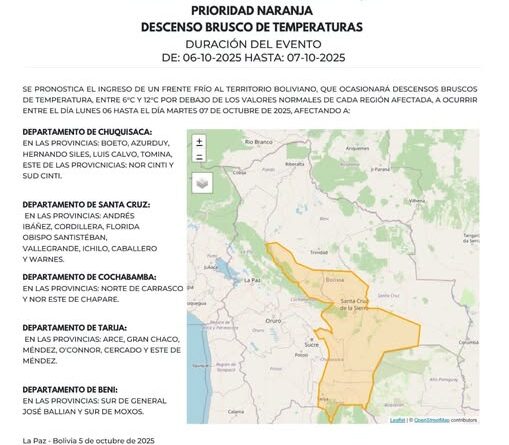 Se pronostica el ingreso de frente frío al territorio boliviano, que ocasionará descenso bruscos de temperatura entre 6º C hasta 12º C por debajo de los niveles normales de cada región afectada a ocurrir los dias lunes 06 de Ocubre al martes 07 de octubre 2025 , afectando a los departamentos