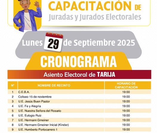 El Tribunal Electoral Departamental de Tarija informa que las capacitaciones a juradas y jurados electorales se están llevando a cabo en los siguientes recintos habilitados.