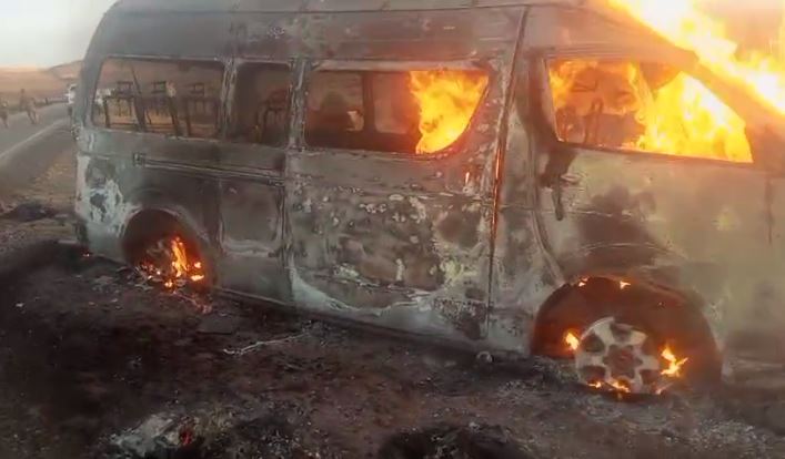 **Tres personas mueren calcinadas tras choque frontal de minibuses camino a Pisiga**