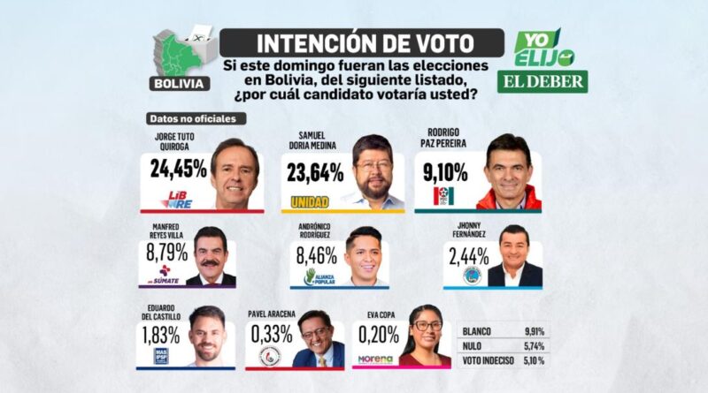 En el segundo bloque de aspirantes, Rodrigo Paz subió al 9,10%, consolidando el tercer puesto, seguido por Manfred Reyes Villa (8,79%) y Andrónico Rodríguez (8,46%). Más rezagados aparecen Jhonny Fernández (2,44%), Eduardo Del Castillo (1,83%), Pavel Aracena (0,33%) y Eva Copa (0,20%).
